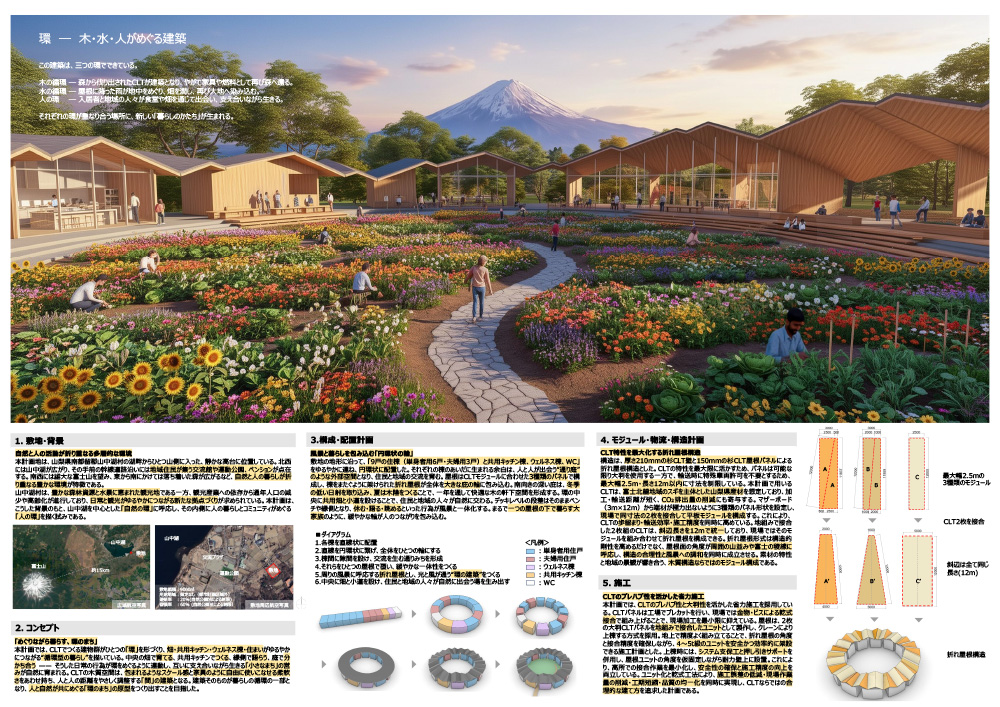 - 山梨県山中湖村の高台に大きな花畑・菜園を囲む円形の高齢者施設で、CLTパネルを斜めに切断して組み合わせた折板の円形屋根の連続と隙間を設けたインテリアの諸室の配列が美しい提案である。
