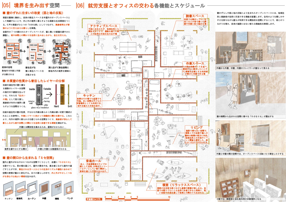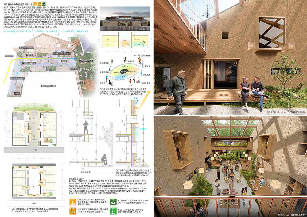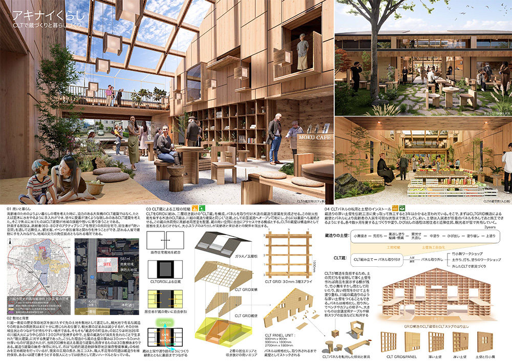 本作品は、埼玉県川越市で想定されており、CLTを利用して木造の蔵造り建築の完成を目指していることが特徴である。建物自体は切り妻の形態をしており、その中間部分の共有スペースに構造を負担するCLTでつくられた大きな界壁が入れられている。この界壁はCLTで組み上げたグリッドをCLTパネルで挟む構造となっており、CLTパネルを付けた状態であれば、その壁面を利用してさまざまな造作物を取り付けることが可能で、入居者が積極的にカスタマイズすることができる。またCLTパネルを外すことで、露出したグリッドを利用して土壁の施工が可能となる。街の人々も含めて塗り壁のワークショップを実施するといった交流イベントも想定されており、地域ならではの環境との調和も意識し、将来の可変性を見込んだ提案が高く評価された。CLTをベースにした土壁はこれまでにないものであり、防火壁としての有効性も含めて、注目度の高い提案であった。