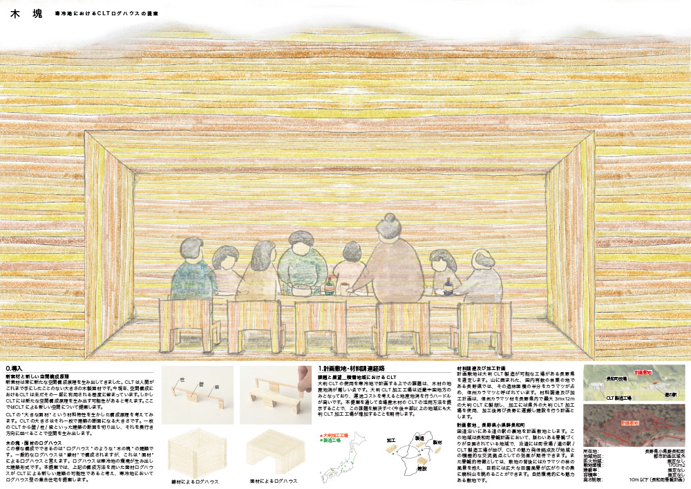 - 長野県長和町の役場や道の駅の裏手の都市計画区域外の林地でCLTの大版を部屋の断面の形に切り抜き、奥行き方向に重ねてマッシブな木の空間を創り出し、木の塊の持つ「力」を建築に活かそうとするファンタジックな提案である。